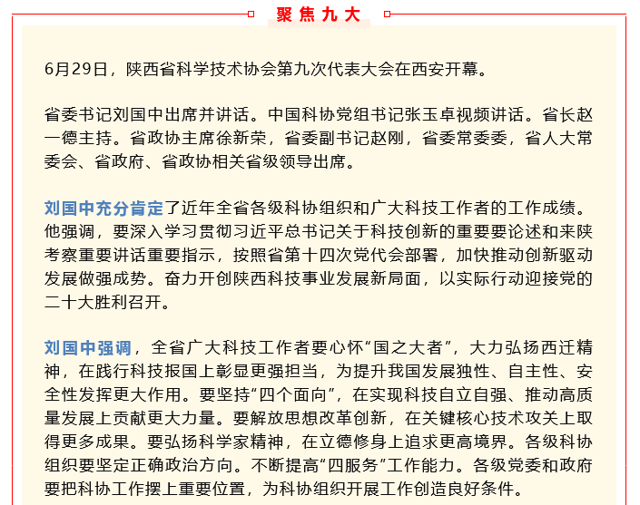 6月29日,陜西省科學(xué)技術(shù)協(xié)會(huì)第九次代表大會(huì)在西安開幕。省委書記劉國(guó)中出席并講話。中國(guó)科協(xié)黨組書記張玉卓視頻講話。省長(zhǎng)趙一德主持。省政協(xié)主席徐新榮,省委副書記趙剛,省委常委委...
