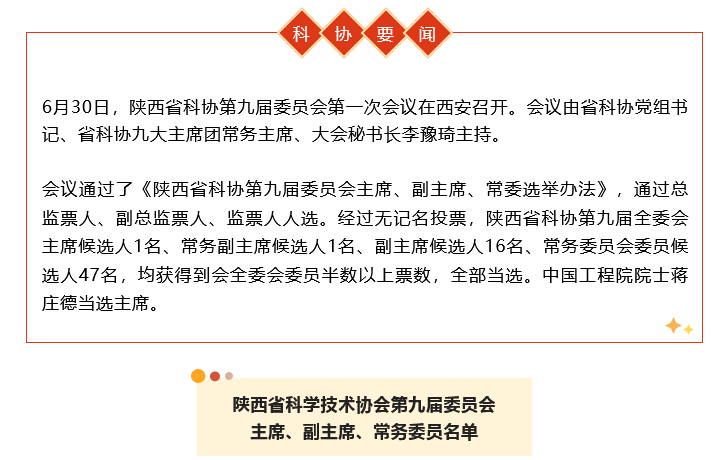 6月30日,陜西省科協(xié)第九屆委員會(huì)第一次會(huì)議在西安召開。會(huì)議由省科協(xié)黨組書記、省科協(xié)九大主席團(tuán)常務(wù)主席、大會(huì)秘書長(zhǎng)李豫琦主持。 會(huì)議通過(guò)了《陜西省科協(xié)第九屆委員會(huì)主席、副主席...