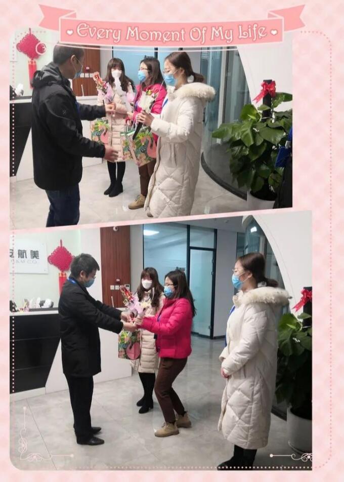 節(jié)日當天下午,楊總攜公司領(lǐng)導為上班的女同事們送上溫馨的祝福和禮物。